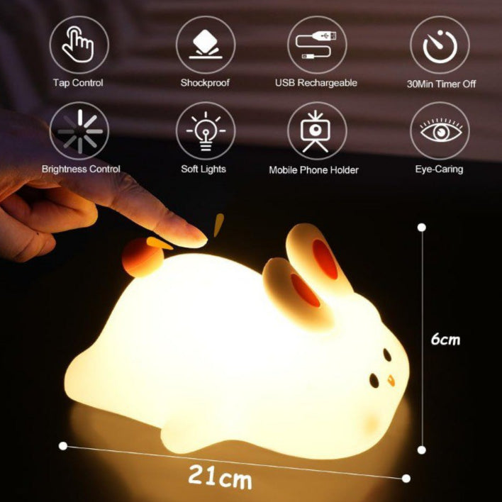 A perfect way to get to know our night light. Solo Bunny includes one silicone bunny lamp that brings a cozy glow to any nursery or bedside table. Its soft warm light promotes restful sleep, while the touch-sensitive control adds gentle interaction. The bunny’s squeezable body makes it both fun and stress-relieving. With a 30-minute timer, it quietly turns off on its own. Great for travel or home use. Simple, lovable, and soothing.